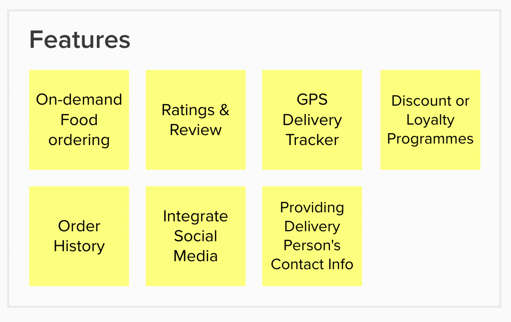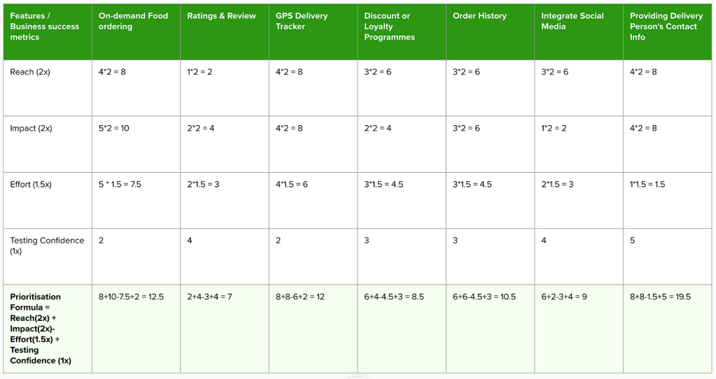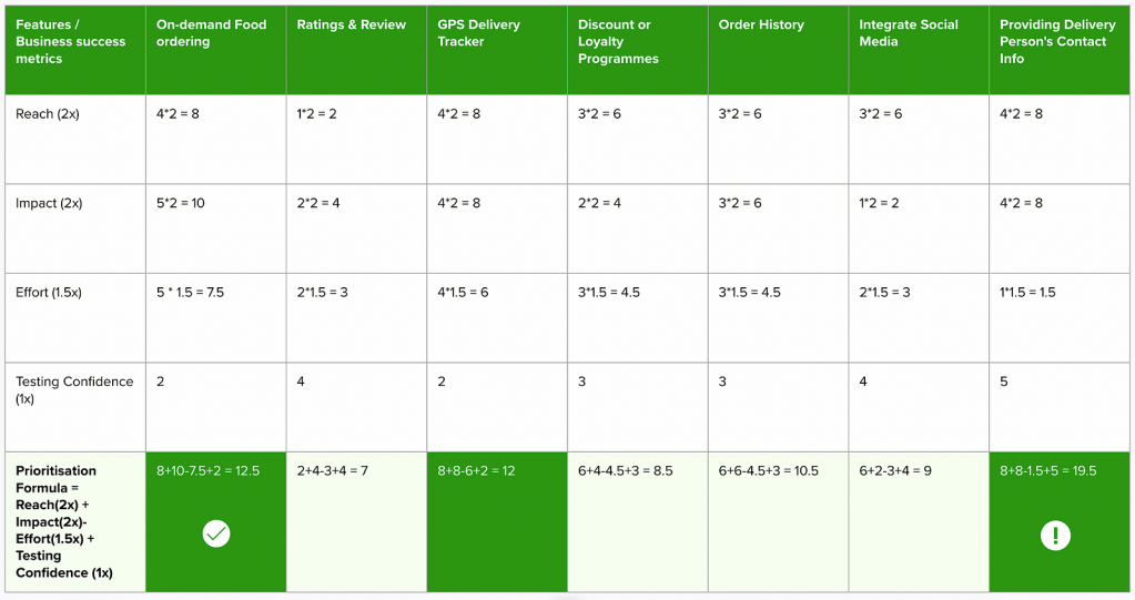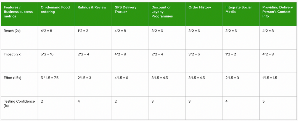 In the above screenshot, though ‘ Providing Delivery Person’s Contact Info’ has the highest output number but it can’t be done with ‘On-demand Food ordering’ feature, which means our first priority becomes ‘On-demand Food ordering’, followed by ‘Delivery person’s contact info’ and further followed by ‘GPS Delivery Tracker’ so on and so forth.