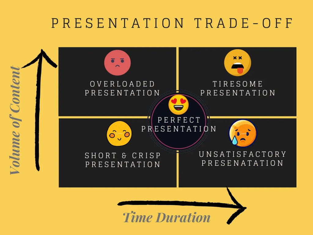 The above graph demonstrates the trade-off between Time Duration and Volume Duration. It iterates that for a presentation to be perfect, we need to look out for optimum time duration with respect to the Volume of content. Apart from a perfect presentation, the above diagram conceptualises 4 more variants of presentation: